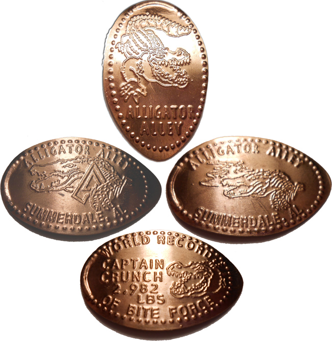 19950 Co Rd 71 Summerdale, AL Website The machine is located inside the gift shop. You do not have to pay to get to the machine. 4 different designs. One vertical and three horizontals. As expected, all 4 designs feature an alligator. Cost 50 cents each (They have pennies on top of the machine)