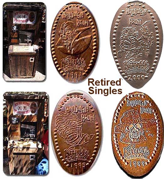 Retired D: Halloween Haunt designs: 1) Skull wearing a hat 1988 2) Mummy 1995, 3) Dracula 1991, 4) Werewolf 2000.