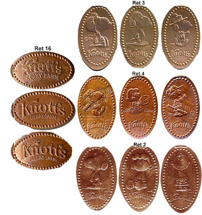 Retired A, 1) Boomerang, 2) Parachute Drop ride, 3) Three Dinosaurs, 4) Three Dinosaures with name under (Large), 5) Marichi in traditional garb playing a guitar, 6) Train steam engine in front of rollercoaster, 7) Three Dinosaures with name under (Small), 8) Image of ride area, 9) Camp Snoopy sign, child each side, 10) Camp Snoopy with one child, 11) Bigfoot Rapids, 12) California Marketplace Knotts. Logo