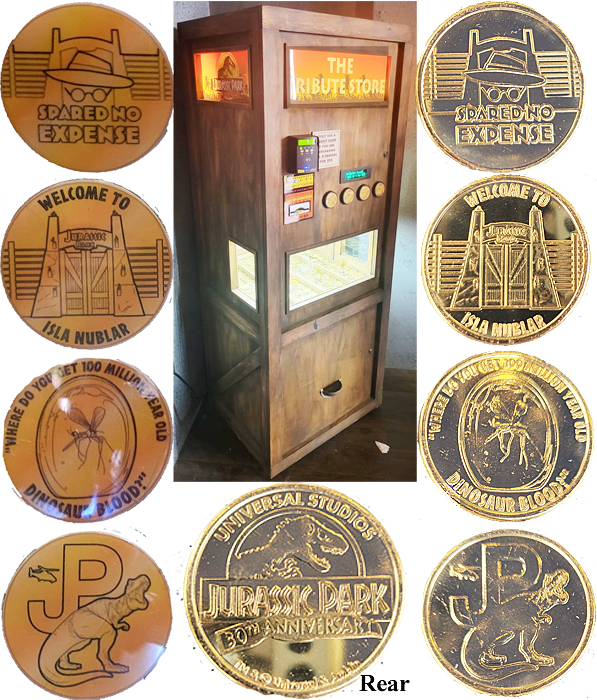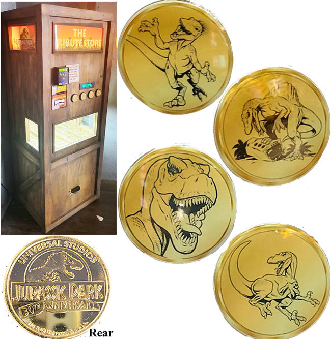 Retired Jurassic Park Token Machine 1: 1) 'Spared No Expence', Cartoon head, entrance to Jurassic Park, 2) 'Welcome to Isla Nublar', Entrance to Jurassic Park, 3) 'Where Do You Get 100 Million Years Old Dinosaur Blood', Mosquito in wax, 4) 'JP', logo with T-Rex, Rear- 30th Anniversary logo.