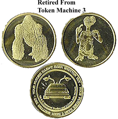 Retired Token Machine 5: 1) 'Jaws', Shark head facing up, 2) '40th Anniversary', ET being carried on a bicycle by the boy to the right, 3) 'Save the Clock Tower (Back to the Future/ Now in Token Machine 3) 4) 'Kong, the 8th Wonder of the World', holding a tram car.