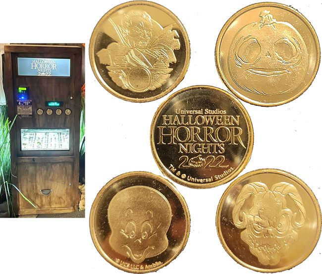 Retired Token Machine 6: 2022 Halloween Horror Nights designs: 1) Scary ram head, 2) Smiling Ghost face, 3) Carved face Pumpkin, 4) Scary Dracula with cape. Rear: Universal Studios Halloween Horror Nights 2022.