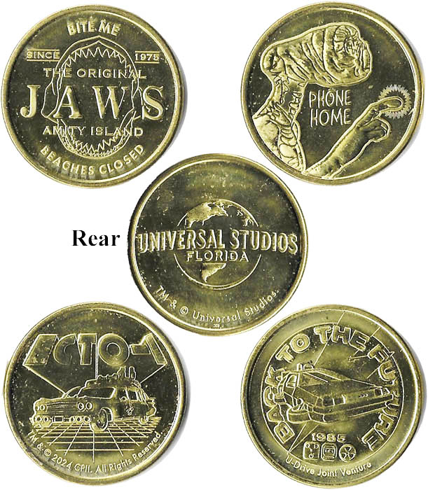 Retired Token Machine 8: 2024 1) 'Ecto-1', Ghostbuster's car, 2) 'Phone Home', ET, 3) 'Back to the Future', DMC DeLorean, 4) 'The Original 'Jaws' Bite Me, Beach Closed, Amity Island Since 1975', name inside shark teeth. Rear- 'Universal Studios Florida', Earth logo.