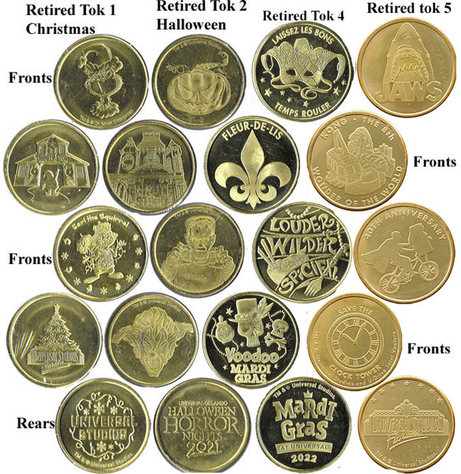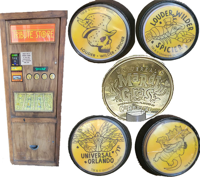 Retired Token Machine 7: 2023 Mardi Gras: 1) 'Louder - Wilder - Spicer', Skull with a hat, 2) 'Louder - Wilder - Spicer', Lobster, 3) 'Universal Orlando', Fancy Theater mask, 4) Cartoon King Alligator. Rear: 'Universal's Mardi Gras, International Flavors of Carnival'