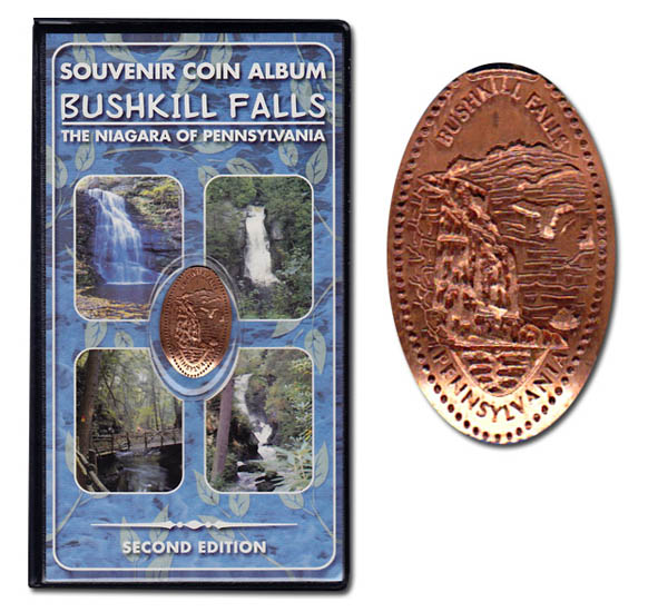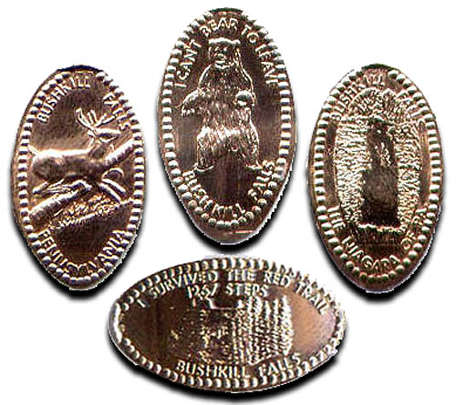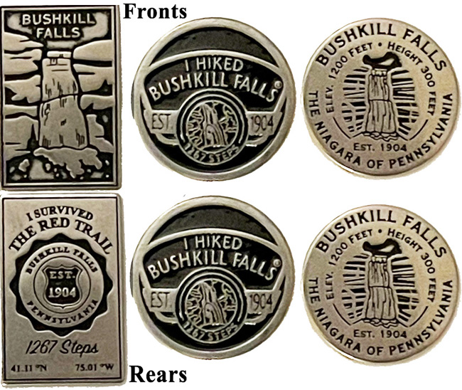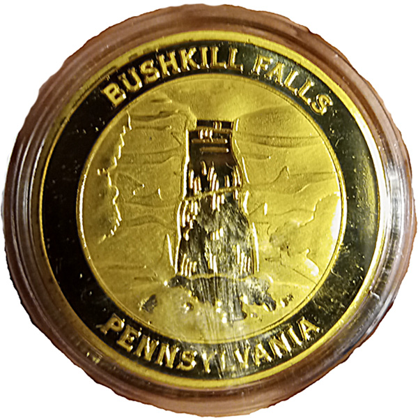 1) Gold Colored Token, Front- 'I hiked Bushkill Falls' with shoe prints/ The back says 'Bushkill Falls Pennsylvania' and has a picture of the waterfall.