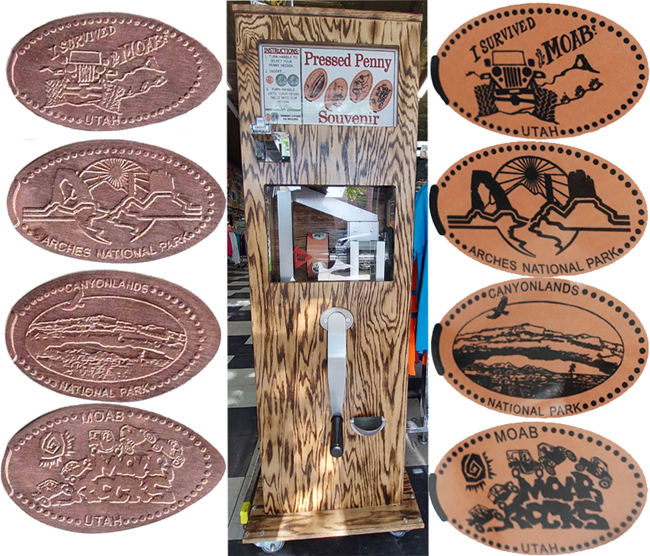 Machine 1 is inside to the right after entry. Cost to press: 51¢ each design. Design all have a beaded border: