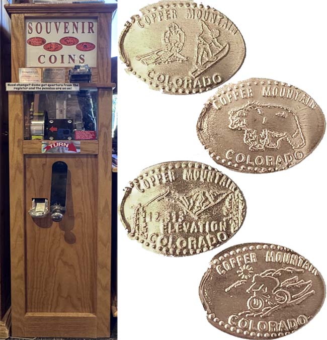 The machine is located to the right of the left door entrance. All 4 coins are symbolic of the Copper Mountain Ski Community. All say Copper Mountain