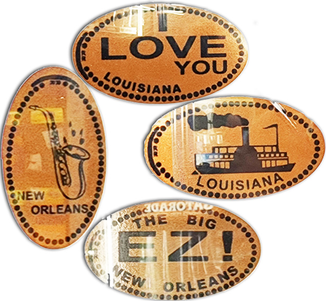 6/18/21: Machine is near the restrooms. There are 4 designs: “Louisiana” with a steamboat, “I Heart Louisiana,” “Big EZ,” and “New Orleans” with a trumpet. Pennies cost 51 cents to roll. |