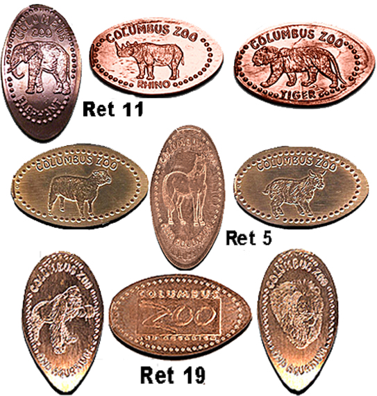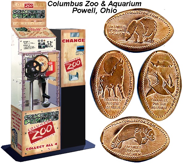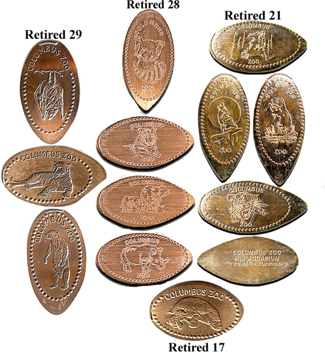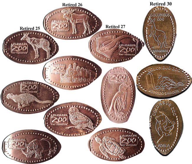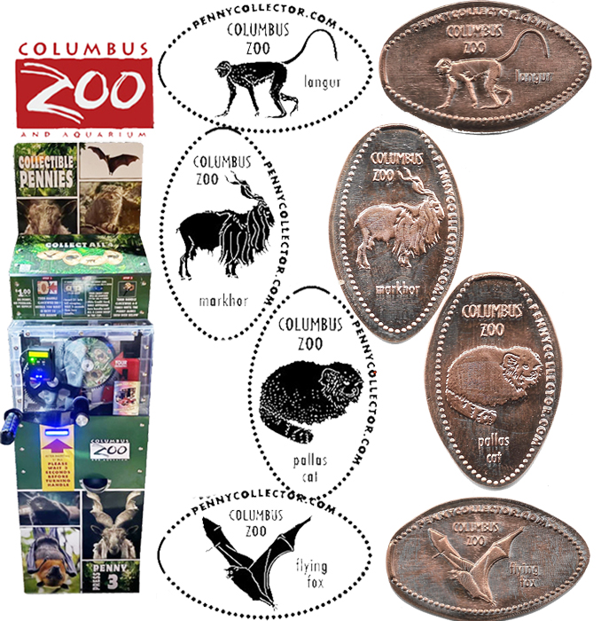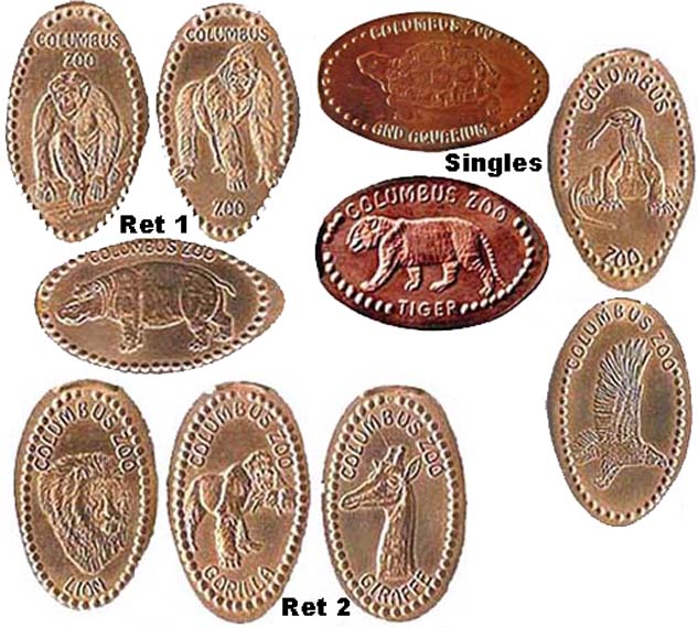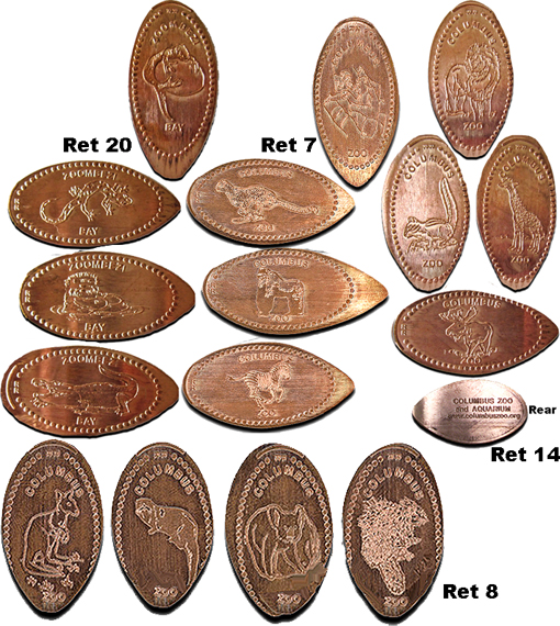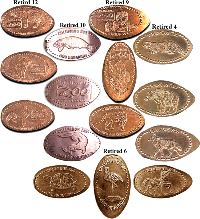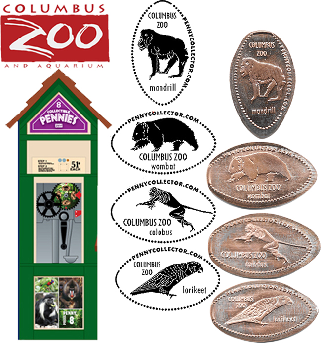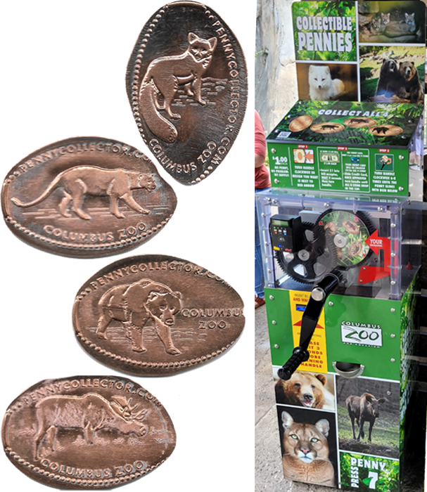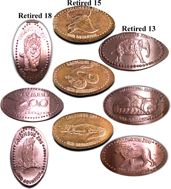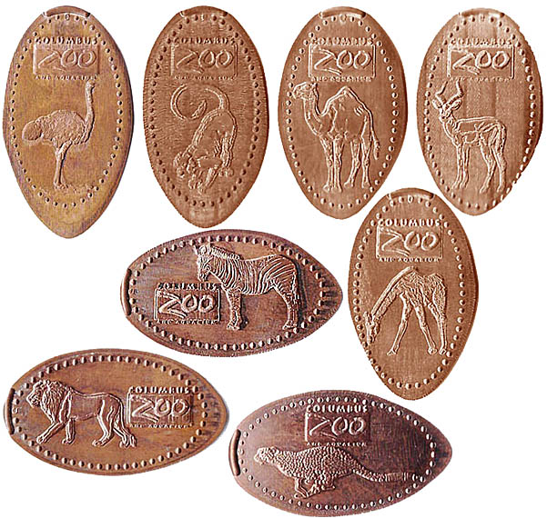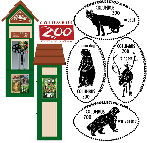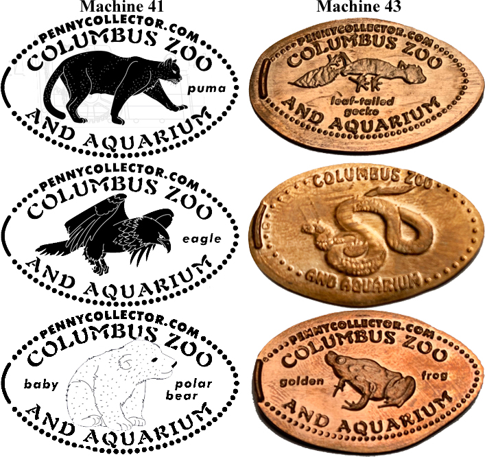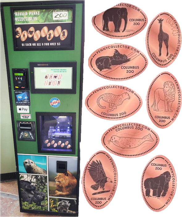 Penny Machine 45: 1) Elephant, 2) Giraffe, 3) Lion, 4) Cheetah, 5) Gorilla, 6) Koala, 7) Harbor Seal, 8) Eagle.