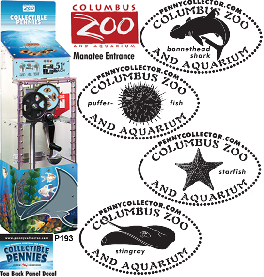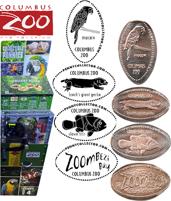 Penny Machine 33 (2015): 1) Clown Fish, 2) Leach’s Giant Gecko, 3) Macaw, 4) Zoombezi Bay