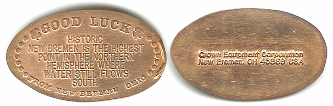 Obverse: Good Luck; Historic New Bremen is the highest point in the northern hemisphere where water still flows south. Reverse: Crown Equipment Corporation, New Bremen, OH 45889 USA.