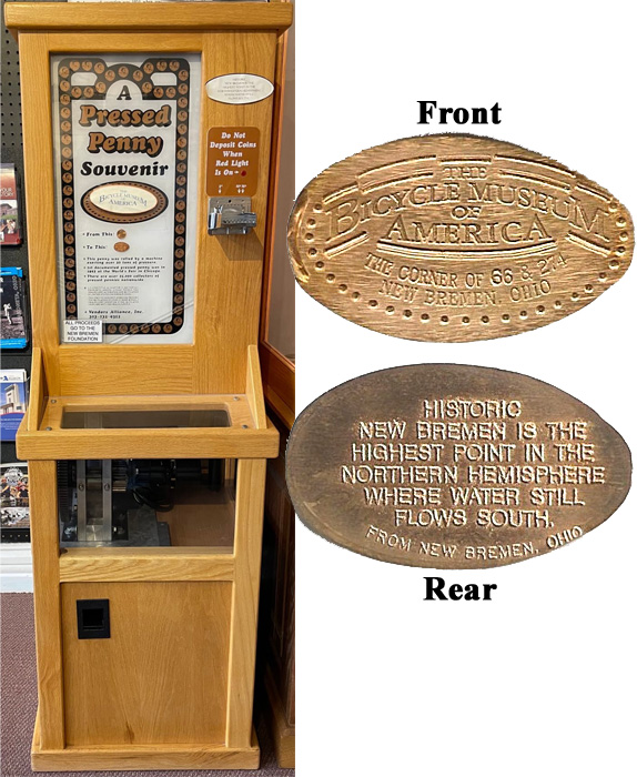 The first side is the Bicycle Museum logo and location, the reverse “Historic New Bremen is the highest point in the Northern Hemisphere where water still flows south.” The machine is located at the entrance of the museum,
