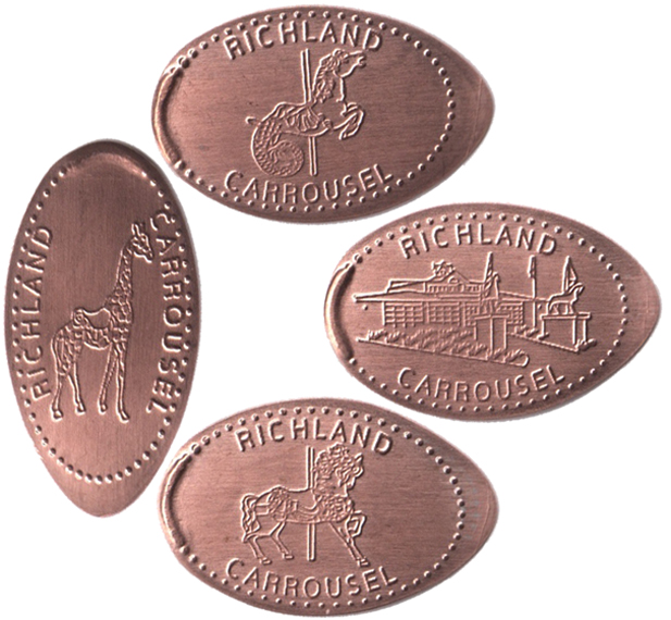 The Richland Carrousel is home to 30 horses and 22 menagerie figures, including 4 bears, 4 ostriches, 4 cats, 4 rabbits, a goat, giraffe, lion, tiger, zebra and a mythical hippocampus.