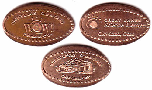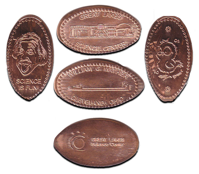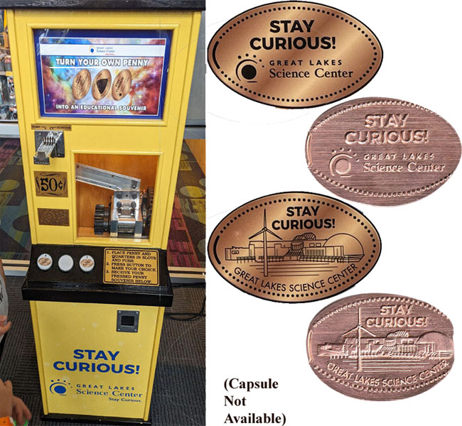 Machine 3 (Placed January 2018) is inside the building. Cost to press: 51¢ each design. Designs all have a beaded border with 'Great Lakes Science Center':