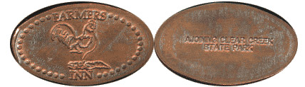 Single design was: A Rooster on front with Farmer's Inn in bubble edge design, reverse has "adjoining Clear Creek State Park" on it.