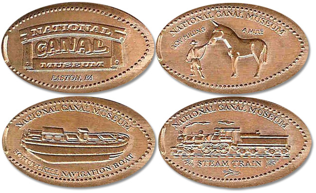Moved 2: 1) Logo "Easton, PA", 2) "Boy pulling a mule", a man with a mule, 3) "Schuylkill Navigation Boat", 4) Steam train engine and tender.