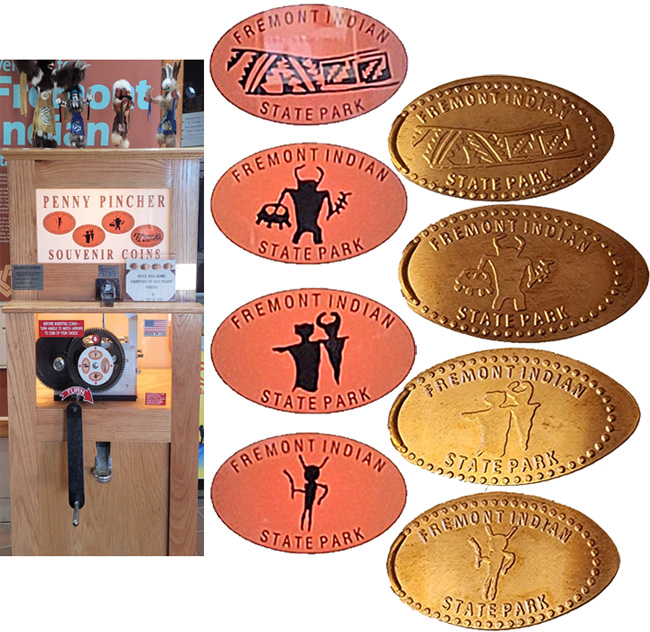 Machine 1 is inside the front doors of the visitors center. Cost to press: 51¢ each design. Designs all have a beaded border with 'Fremont Indian State Park':