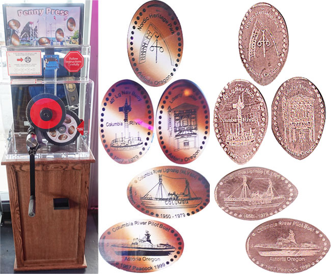 Machine 1 is inside to the right of the entrance door. Cost to press: 76¢ each design. Designs all have 'JP' at the catch notch and a beaded border: