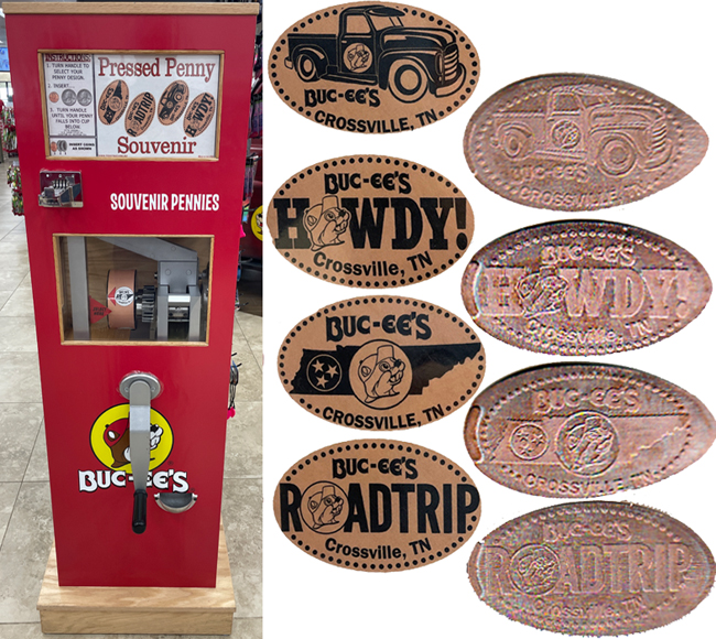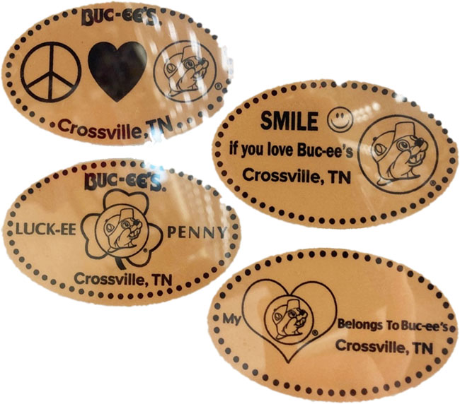 Machine 2: All say Crossville, Tn on them, as well as the Buc-ees logo. Designs are: