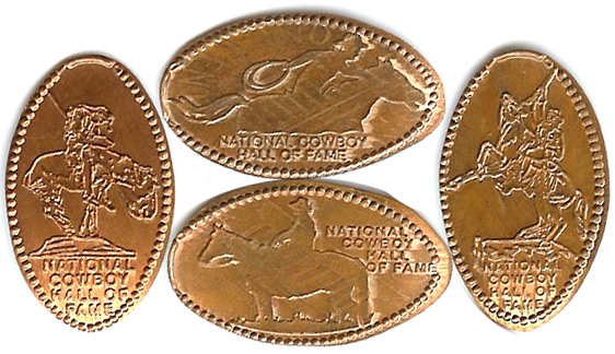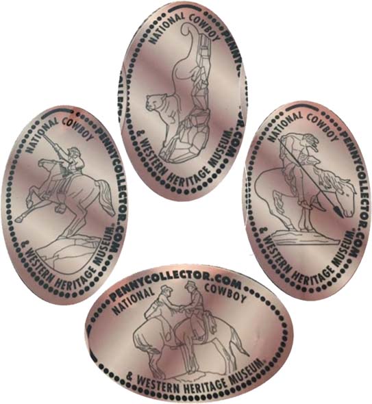 Machine 2 is in the kids area of the gift shop which is in the back right corner. All have "National Cowboy & Western Heritage Museum" and "PennyCollector.com" on them. All art work represented on pennies is on site.