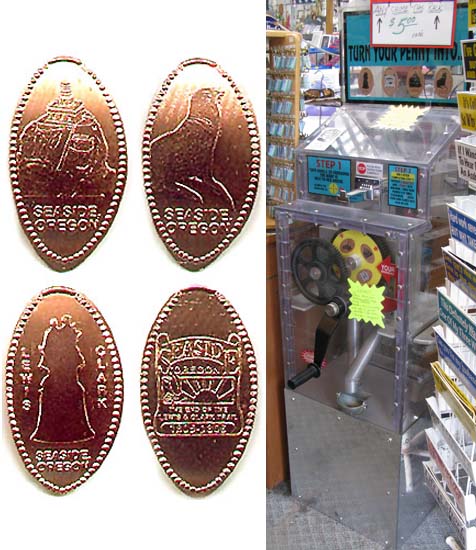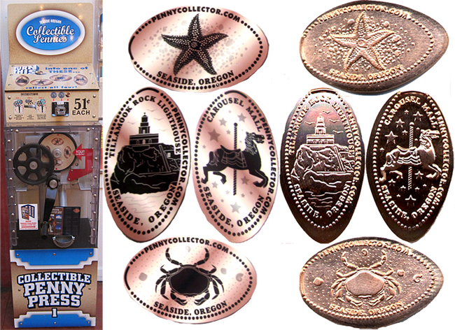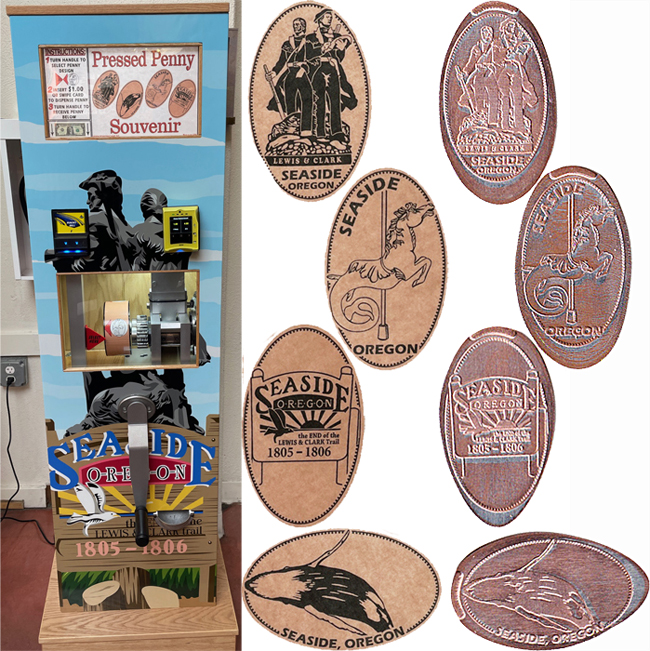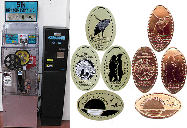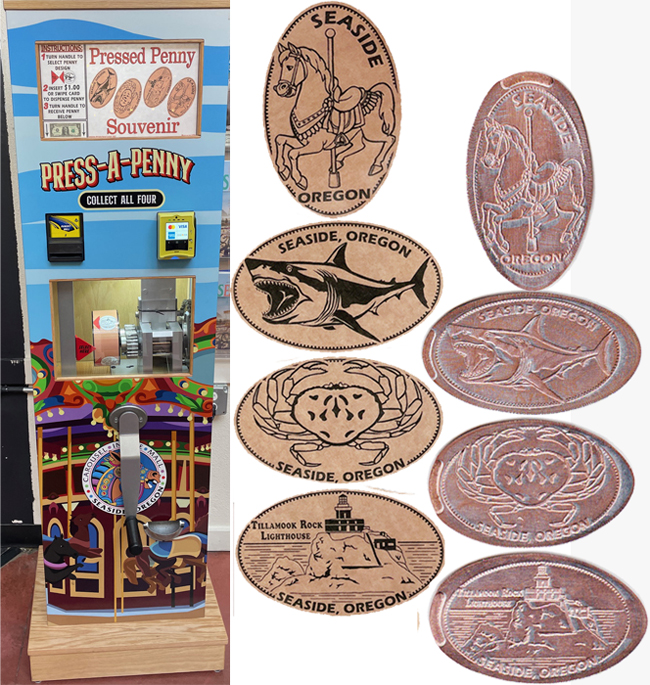 Machine 5 (Placed 2025) is inside on the east side of the Carousel to the right. Cost to press: pre-loaded with Zinc pennies for $1 for one ($1.00 dollar bill only) OR Credit card for $1 charge for one design only. Designs all have a beaded border with 'Seaside, Oregon':