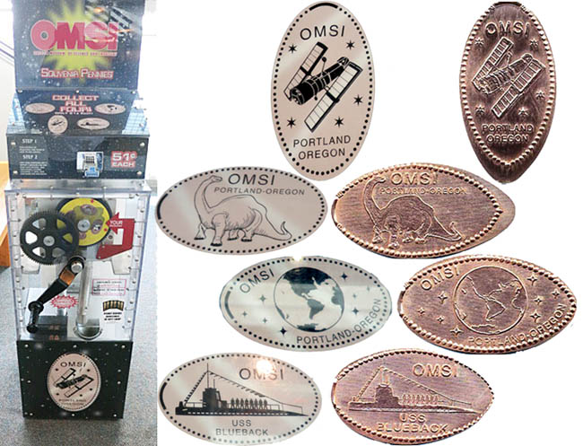 Both penny machines are located next to each other in the Planetarium hallway hidden behind the Gemini Capsule. You do not need to pay admission to access them.