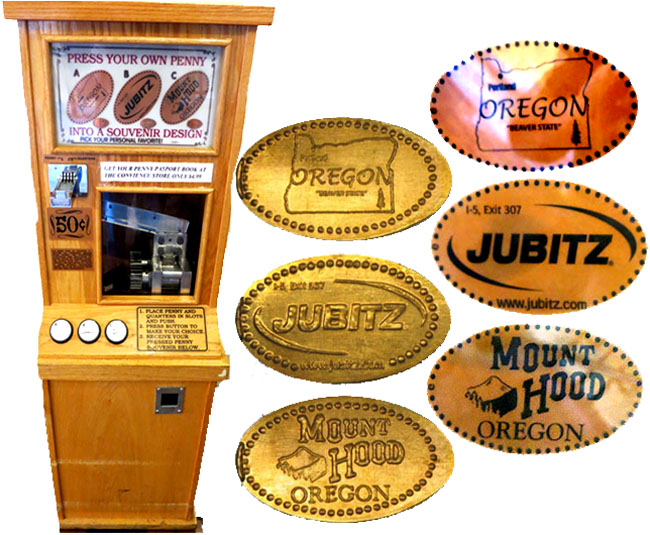 Machine 1 Located against the wall near the Peterbilt display in the Cascade Grill area. Cost to press: 51¢ each design. Designs are: