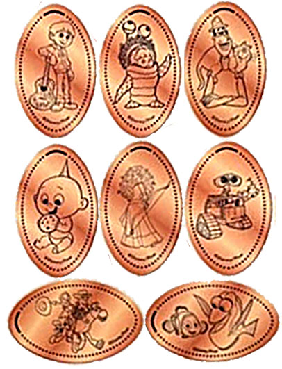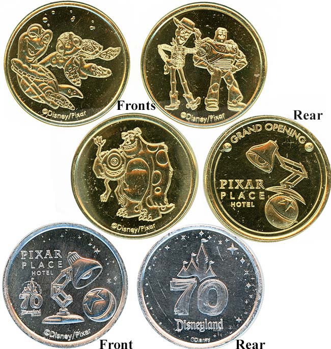Retired Token Machine 1: (Numbers DRM128-130 & 167) 1) Dug & Russel (UP the movie) (Rear- 'Grand Opening Pixar Place Hotel), 2) Woody & Buzz, (Rear- 'Grand Opening Pixar Place Hotel), 3) Crush & Squirt (His Son/ Finding Nemo), (Rear- 'Grand Opening Pixar Place Hotel), 4) 'Soul 2020', two characters (Pixar Fest, Celebration Friendship and Beyond)