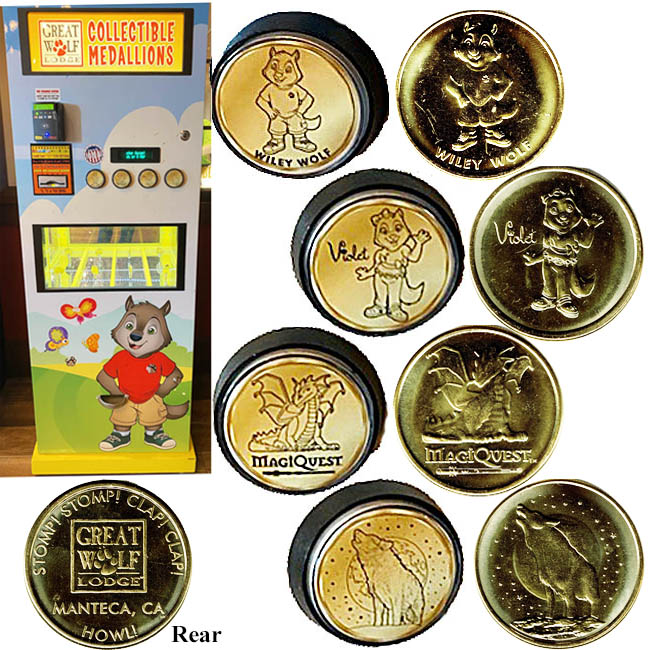 All have 'Great Wolf Lodge Manteca, CA' (Except the barrel design has no city and state) on them. 8 design penny machine designs are: