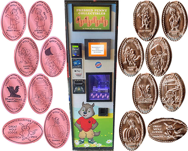 04/30/23:Penny machine is by the Great Wolf Candy Company. Worked fine with cash and zinc pennies.
