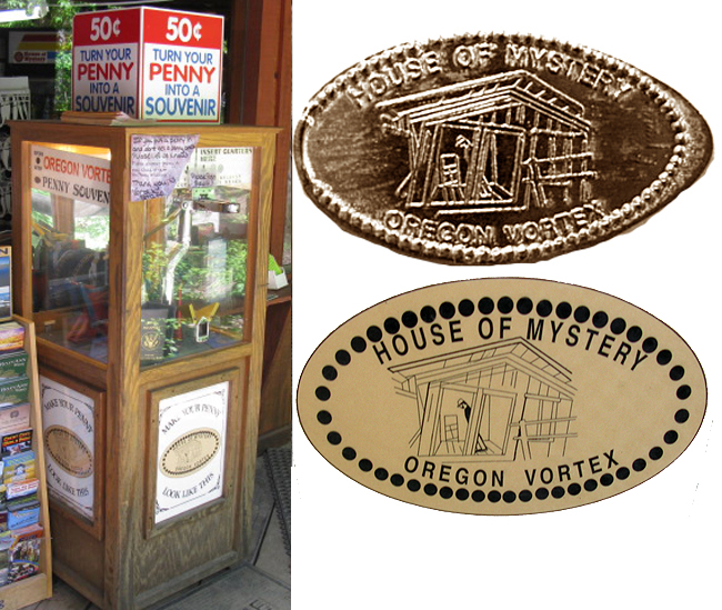The penny machine is on the back porch of gift shop. Cost to press: 51¢ each design. Design has a beaded border: