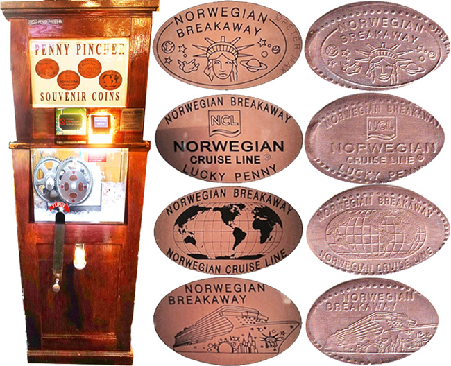 Machine 1 is on Deck 7 in O'Sheehan's Bar & Grill by the arcade games. Cost to press: $1.99 each design that is pre-loaded with 97.5% zinc 2.5% copper (Zinc) American pennies. You need to press and hold for 4 seconds your cabin keycard vertically against the reader to use the machine; no cash accepted. You need to wait until the red light turns to green before you start cranking. Designs all have a beaded border with 'Norwegian Breakaway':