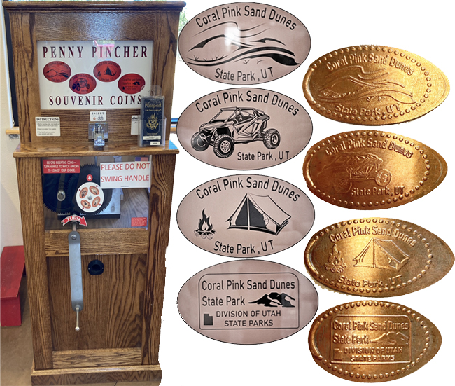 All have 'Coral Pink Sand Dunes State Park' on them. Cost is 51ยข each. The machine is to the right of the double doors upon entrance. Designs are: