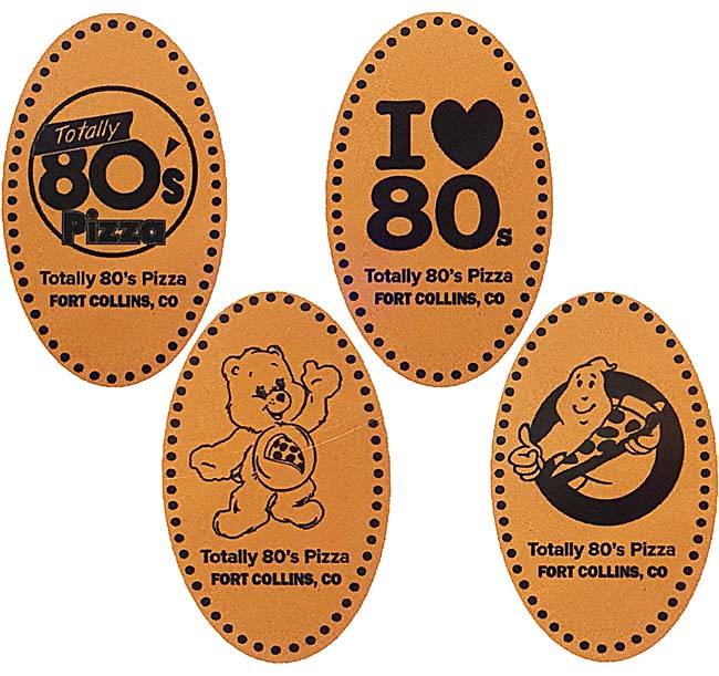 All have 'Totally 80's Pizza Fort Collins, CO' on them. Designs are: