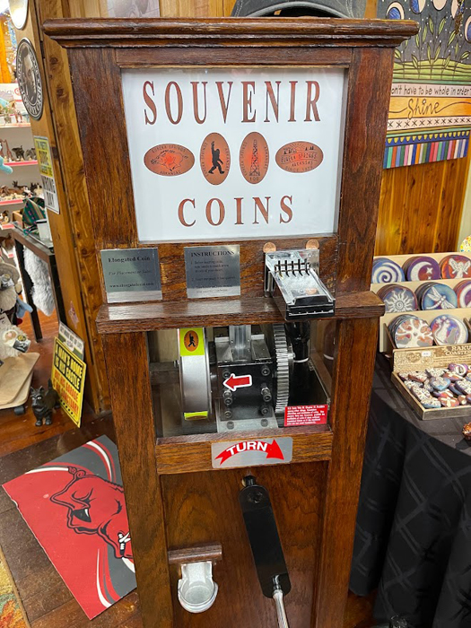 579 W Van Buren, Eureka Springs , AR , 72632 The machine is located closer to the back of the shop just past and across from the register. Designs cost 4 quarters and your own penny