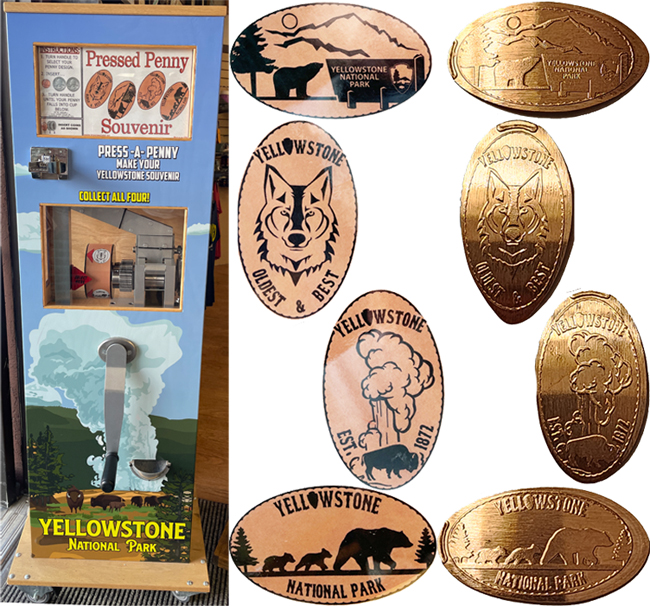 Machine 1 is inside the entry door off of Canyon Street. If you take the main entry door you have to go to the right towards the room on the right where there is a second register and entry it is right by that door. Cost to press: 51¢ each design. Designs all have a ringed border with 'Yellowstone':