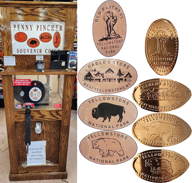 Machine 1 is inside close to the cash register. Cost to press: 51¢ each design. Designs all have a beaded border with 'Yellowstone':