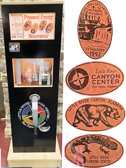 The pressed penny machine is located in the lobby of the Little River Canyon Visitor Center. It is on the left side when you walk in. They cost $0.51 each. Designs are:
