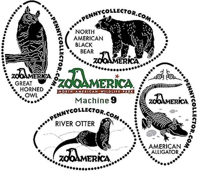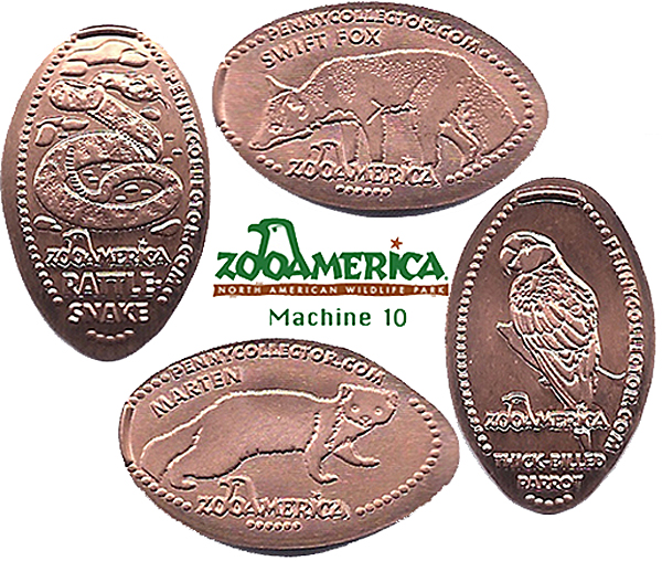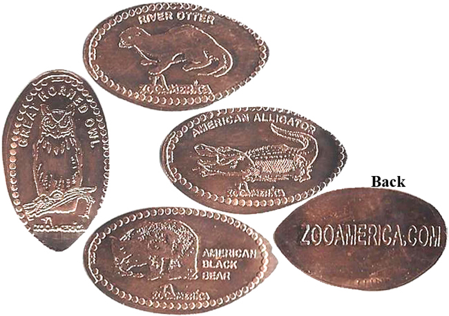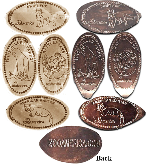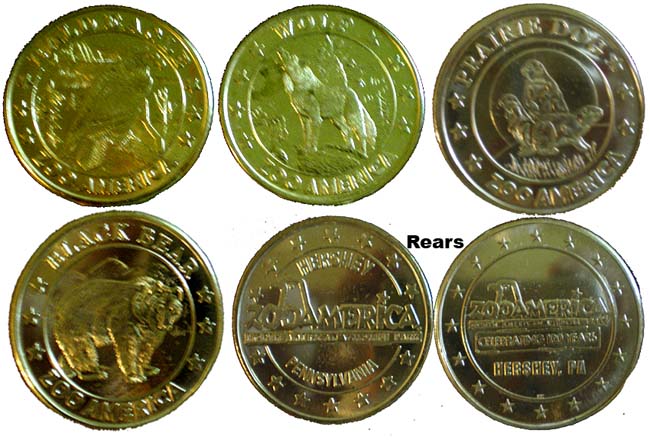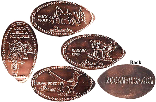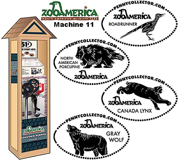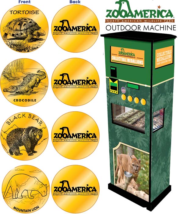 Retired Token machine 1: 1) Meercats, 2) Bear, 3) Wolf howling, 4) Bird, Rear- ZooAmerica logo with City State.