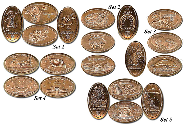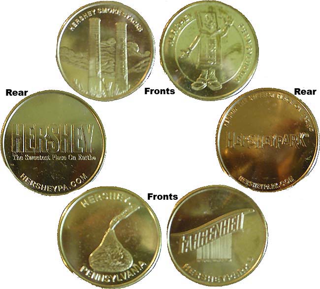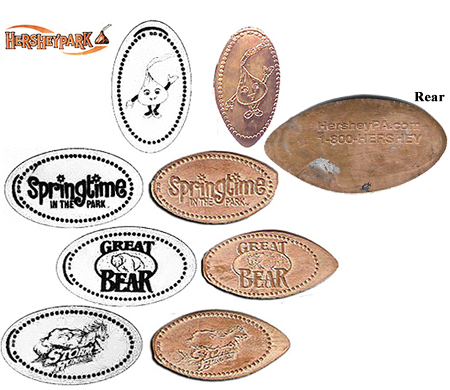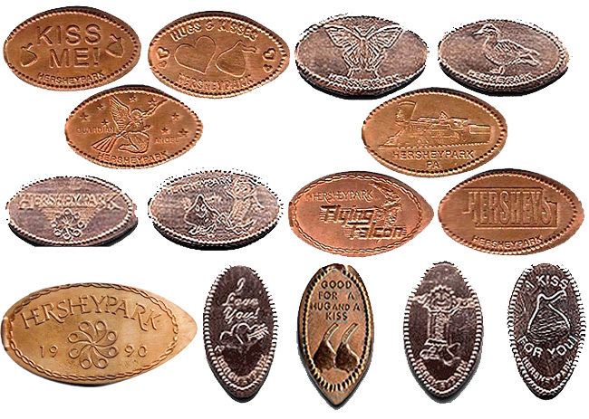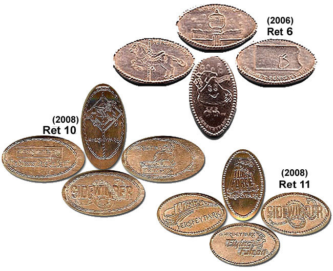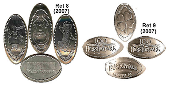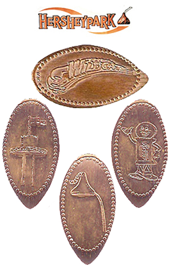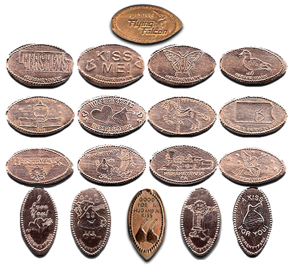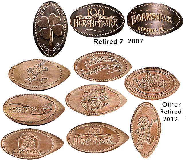 Retired A: 1) Hersheypark 1990, 2) 'Kiss Me Hersheypark', 3) 'Good for a Hug and a Kiss', 4) 'I Love You Hersheypark', 5) 'Hersheypark', a Hershey bar, 6) 'A Kiss for You Hershey Park', 7) 'Hersheypark', flower logo, 8) 'Hersheypark', a Hershey kiss and bar, 9) 'Hersheypark, Flying Falcon', 10) ;Hershey's Hersheypark', logo, 11) 'Guardian Angel Hersheypark', 12) Hersheypark, PA', tour train, 13) 'Kiss Me Hersheypark', 14) 'Hugs and Kisses Hershey Park', 15) "Hersheypark', Butterfly, 16) 'Hersheypark', Duck.