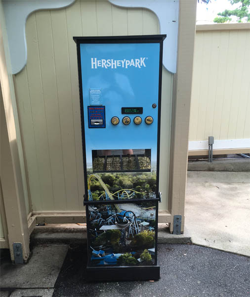 Machine 22: (2024): In Hersheypark Supply Co., the large gift shop next to the main entrance. Machine is located next to the stairs. It does not accept cash. Machine is accessible without entering the park.