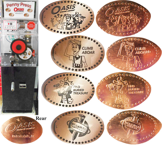 27801 County Road 64 Ext Robertsdale , AL , 36567 Phone: 251-960-1150 Website Penny Press machine is located near the front of the store. Should see to the right when exiting. Left when entering. Enter through the novelty Volkswagen bus. Costs $1.01 per Design. All designs have Oasis Travel Center on the Back (Mule).