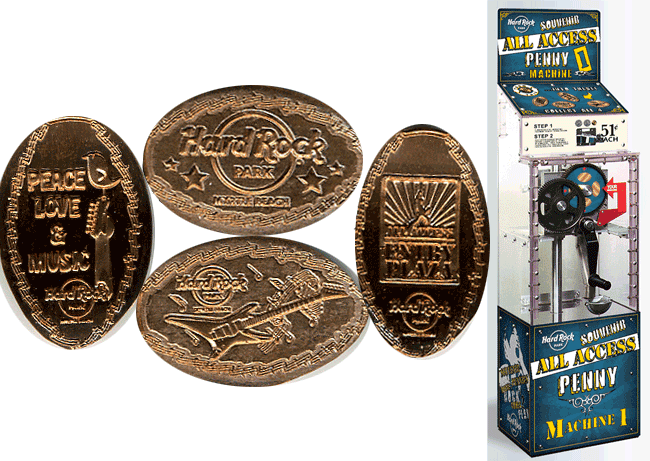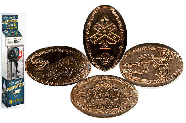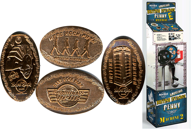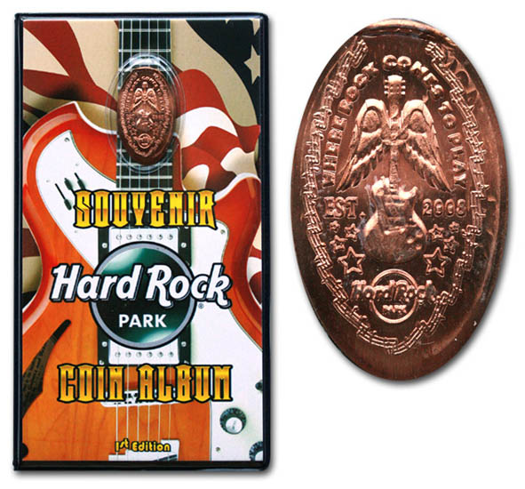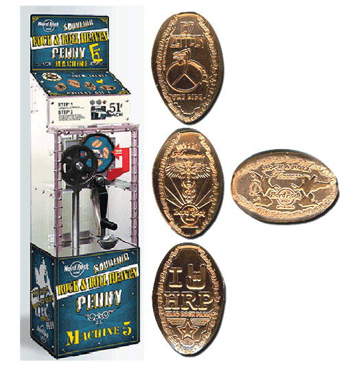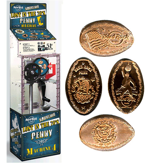 Designs were: 1) Peace, Love and music', with hard rock logo, 2) Logo with city under, 3) Guitar with logo over left, 4) Plaza name, logo under.