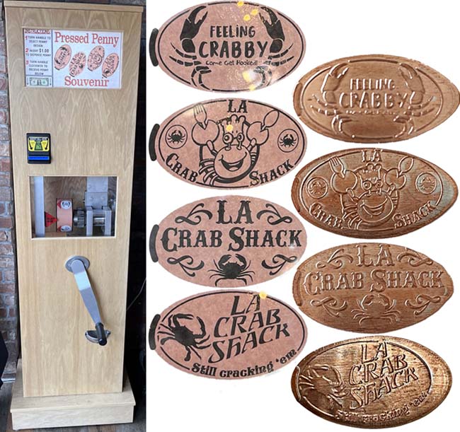 Machine 1 is in the front door and turn left. You will see it on the far wall. Cost to press: $1.00 each and has pre-loaded Zinc pennies. Designs all have a ringed border: