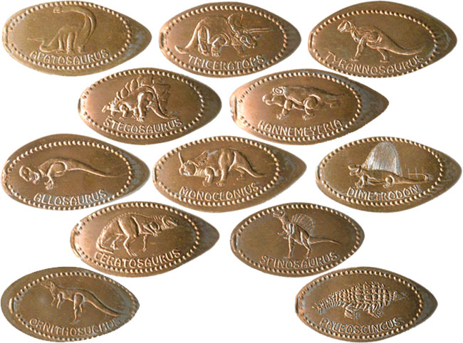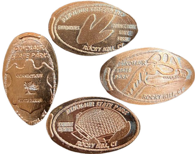 Machine 3: is on the main level after the exhibits. You can't miss it! Takes a dollar bill, pennies already loaded. Accepts credit card and dollar bills. $1 per penny. All have 'Dinosaur State Park Rocky Hill, CT' on them. Designs are: