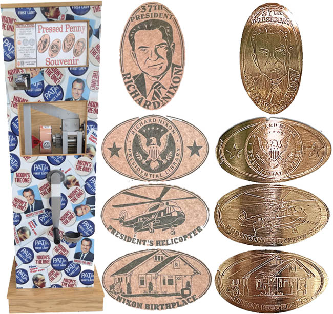 Retired 2: 1) (H) Sikorsky VH-3A Sea King helicopter (Marine One) flying above the White House with 'President's Helicopter', 2) (V) Richard Nixon with '37th President Richard Nixon', 3) (V) Presidential seal with 'Richard Nixon Library & Birthplace', 4) (H) Birthplace house with 'Nixon Birthplace'.