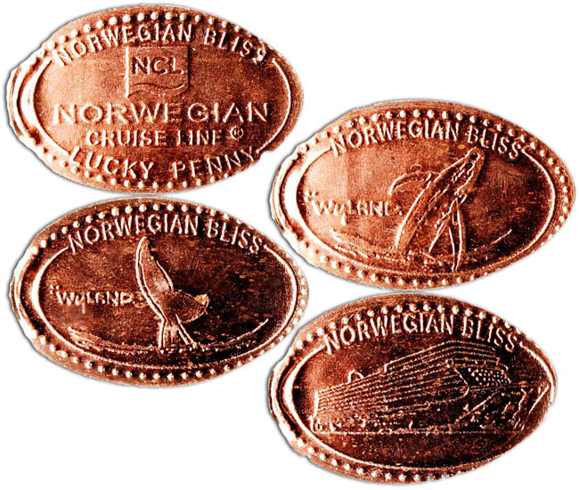 South America Way, Dodge Island 1922-2298 North Cruise Boulevard Miami, FL , 33132-2012 Phone: (866) 234-7350 Website The machine is on Deck 7 in The Local Bar & Grill by the bowling alley. Cost to press: $1.99 each design. It is pre-loaded with Zinc American pennies. You need to swipe your cabin keycard to use the machine; no cash is accepted. Designs all have 'Norwegian Bliss' on them
