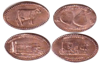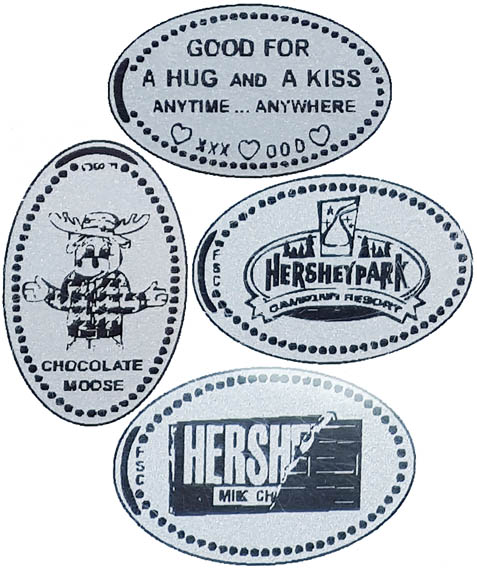 1) Picture of a cow (H), 2) 'HUGS & KISSES' across top, pic of a heart and a Hershey Kiss, says 'HERSHEY, PA' across bottom (H), 3) Amish horse and buggy design, "AMISH COUNTRY' top, "PENNSYLVANIA, bottom. (H), 4) A RV (5th wheel type) and some trees, 'HIGHMEADOW CAMPGROUND' top 'HERSHEY, PA' bottom. (H) |