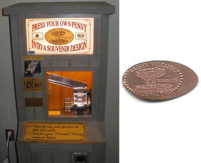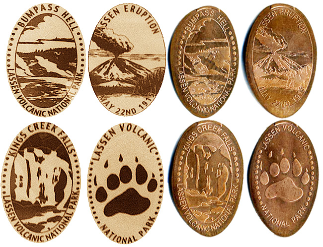 Machine 2: Located at the Kohm-Yah-Mah-Nee Visitors Center near the southwest entrance to the park, inside the gift shop next to the cafe. Cost to press: 51¢ each design. Designs have a beaded border except design #2 has a ringed border: