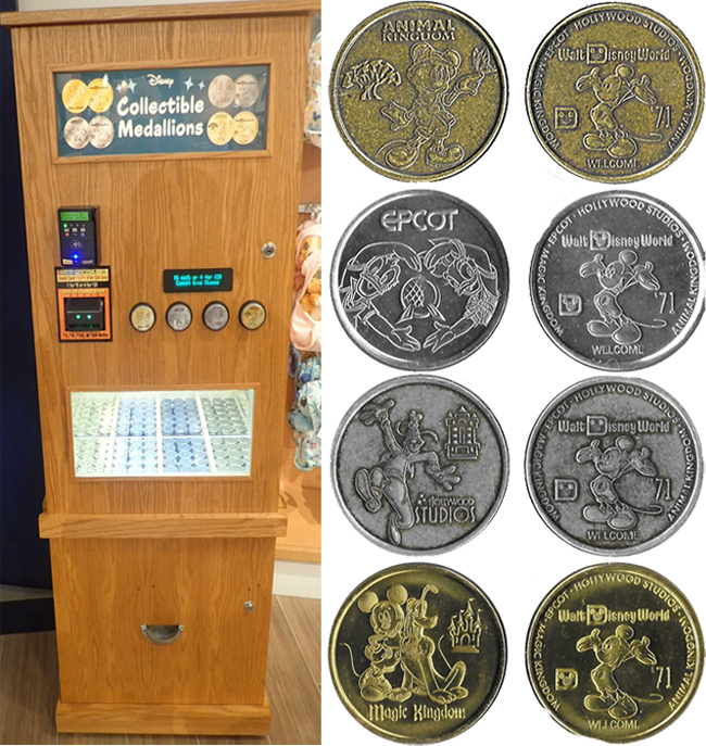 Retired Token Machine 2: 1) 'Animal Kingdom', Safari Mickey with a butterfly on left finger, Tree of Life in left, (Brass color), 2) 'Epcot', Top of Donald and Daisey on either side of 'Spaceship Earth' (Chrome color), 3) 'Hollywood Studios', Happy Goofy dancing right of the Tower of Terror (Metal color), 4) 'Magic Kingdom', Mickey holding Pluto right of small Castle, (Gold color),